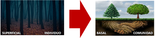 Este cambio de enfoque supone avanzar involucionando de la visión superficial del bosque/individuo que hemos construido a la visión basal de la malla relacional de las comunidades humanas de la que partimos y en la que se fundamenta cualquier potencialidad constructiva de la persona en su entorno.